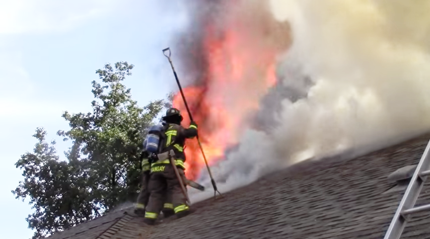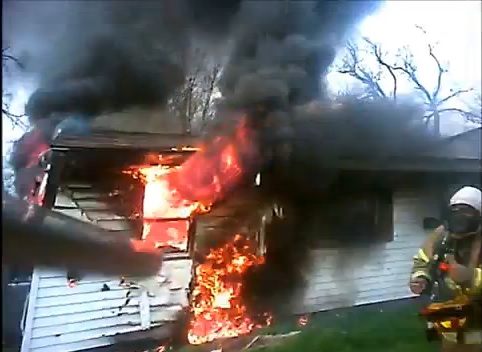 At about 4:40 on the clip burning fuel that comes pouring out after a door is cut.
