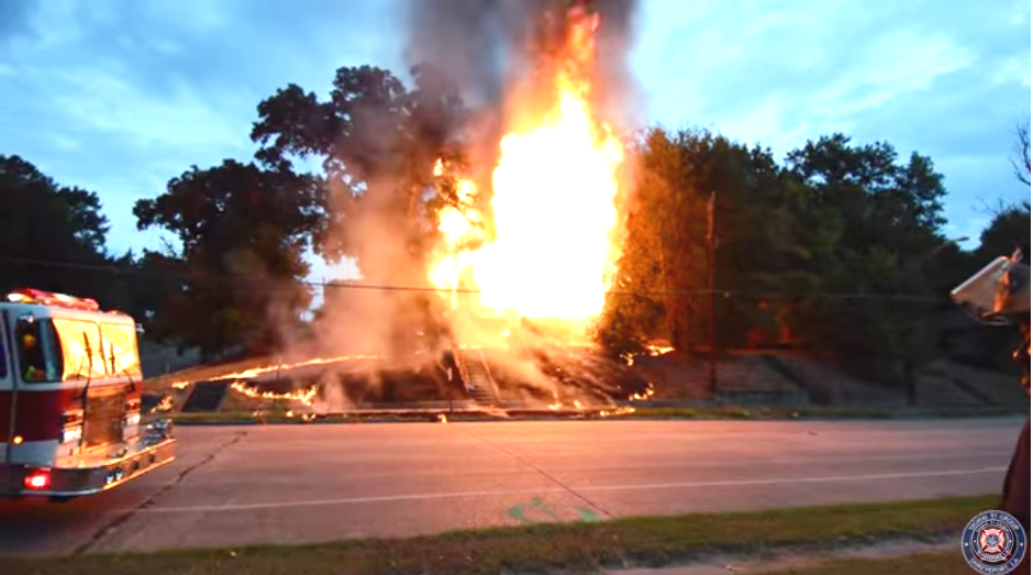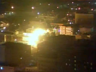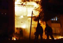 Flames tore through the roof, sending billowing clouds of heavy black smoke rolling over the rooftops as firefighters doused the buildings with water sprayed from extended ladders hovering over the street, according to witnesses.