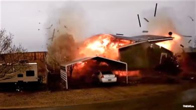 The home’s yard appeared to be packed with vehicles, mattresses, debris and items covered by a large blue tarp, aerial video showed.