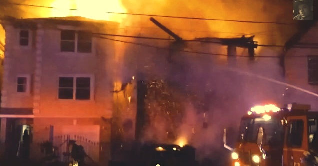 Two angles on the rescue of a burned man on his balcony at an apartment fire today (Tuesday) in Brockton, Massachusetts. Four firefighters were injured, including the incident commander’s son.