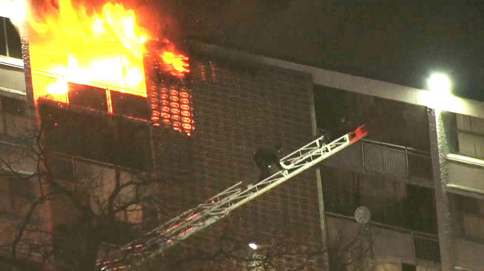 The helicopter then gets snagged on the platform, tilting sideways as blades smash into the asphalt and spin upward.