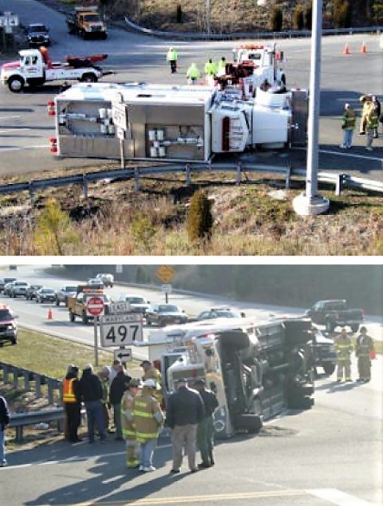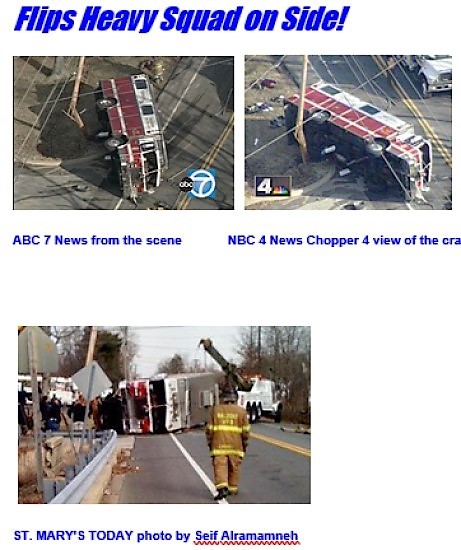That crash occurred one day after Squad 7 from the St. Leonard VFD & Rescue Squad in neighboring Calvert County overturned (below) while responding to a report of a stove fire.