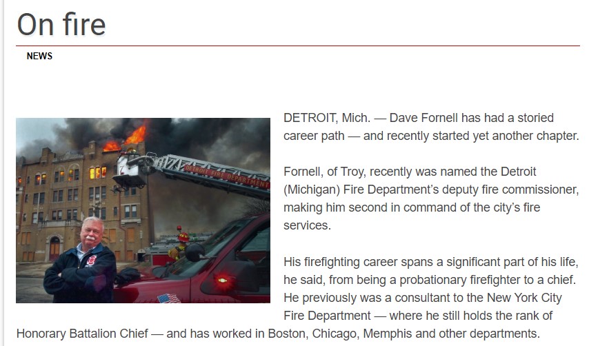 Fornell told WXYZ-TV that the pictures of him posing and smiling while buildings are burning were taken before he became deputy commissioner in Detroit. But the caption with the Piqua Daily Call article does not support Fornell’s claim: “Provided photo Dave Fornell poses for a photograph at his first extra-alarm fire after joining the Detroit Fire Department. The fire was a third-alarm fire in a vacant apartment building in Highland Park.”
