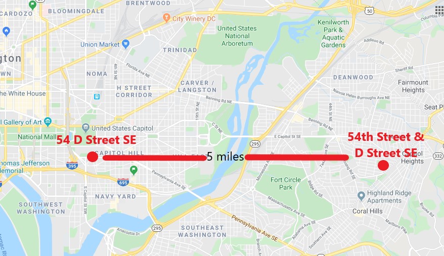 Since Friday’s DC Line article I’ve found two more suspicious OUC calls. One was yesterday (Sunday) morning when OUC dispatched DC Fire & EMS to a stabbing at 54 D Street Southeast on Capitol Hill. The engine crew on the call soon discovered that they were 54 blocks or 5 miles from the correct location–54th Street and D Street Southeast. The officer in charge of Engine 18 found that error because the correct location was on the screen in front of him. It was written by OUC in the dispatch notes attached to the call. But that’s not all folks.