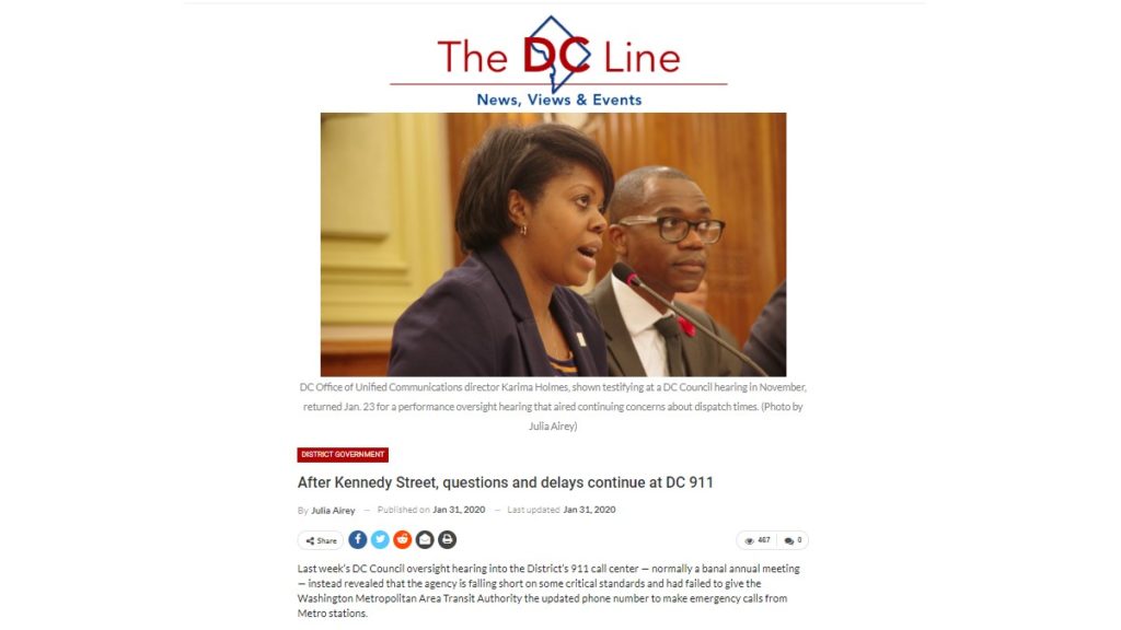 Reporter Julia Airey wrote about the NTSB investigation for DC Line on Friday. After the fatal 2015 L’Enfant Plaza tunnel fire NTSB told OUC Director Karima Holmes there should be an “‘independent outside audit’ of the average time it takes employees to process and dispatch calls compared to national averages.” That’s because OUC wasted almost six-minutes before dispatching firefighters & EMS to the Metro fire. Here’s what NTSB told Airey last week about the audit that never happened: