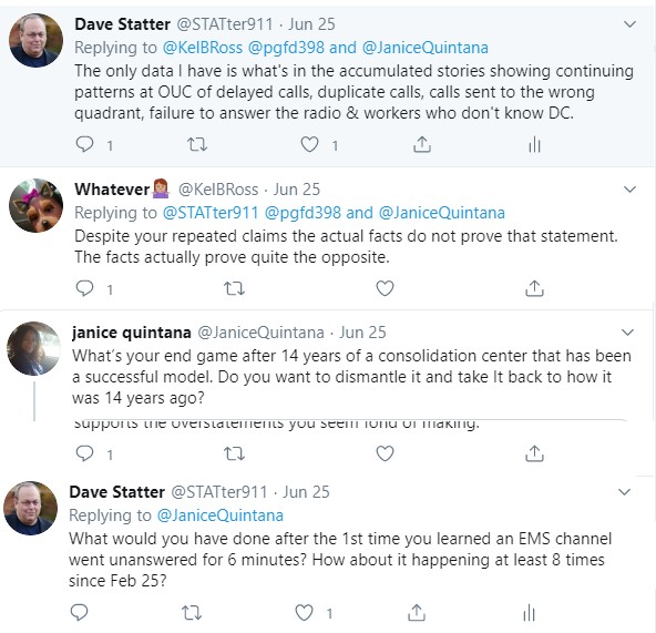 I answered the pointed questions about my conclusions by saying these are my judgments. Those judgments are based on my unique experience of covering 911 in DC for almost 40-years. In addition, I’ve more recently created my own database of OUC failures. Just since the end of February, I’ve documented almost 150 incidents. I’m alerted to these mistakes by tips from firefighters, OUC workers and my own scanner listening. Even then, I don’t don’t have time to document all that I find and I’m sure I’m not finding them all.