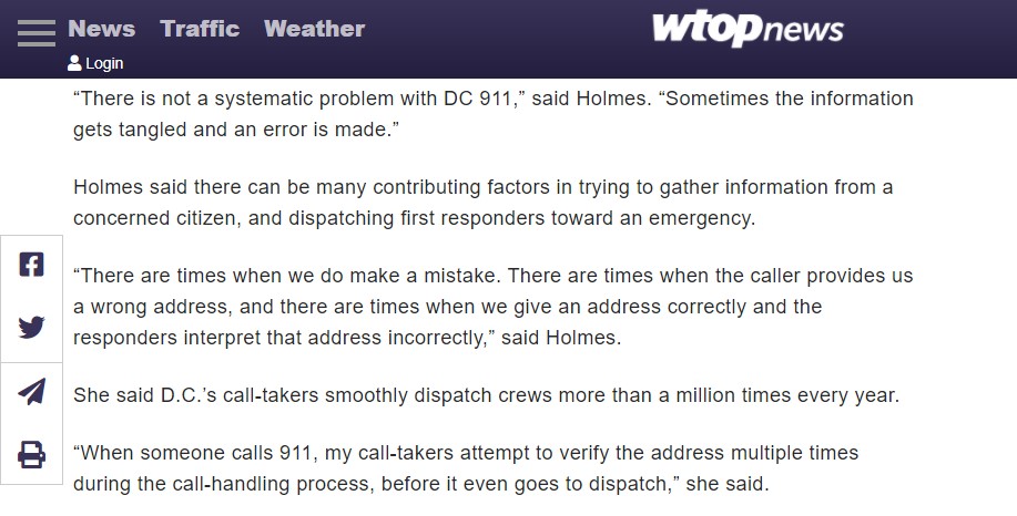 In interviews Thursday on WAMU’s “The Kojo Nnamdi Show” and with WTOP Radio’s Neal Augenstein, OUC Director Karima Holmes said “Dave Statter is not my oversight” and “There is not a systematic problem with DC 911.”