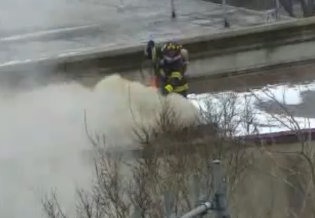 A dispute between firefighters from the District of Columbia and Prince George’s County, Maryland occurred at an emergency scene Saturday night after a DC Fire & EMS Department engine parked on a PGFD attack line. It happened as crews were handling a collision where one vehicle was on fire and another overturned. The crash was just inside the District of Columbia near the Prince George’s County border. After showing what appeared to be helmet-cam video of the confrontation (above) on a Sunday night newscast, WTTG-TV/FOX5 reporter Evan Lambert said he talked with witnesses who told him the incident did not appear to be intentional.