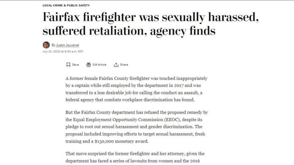Never underestimate the ability of the lawyers representing Fairfax County to make a bad situation worse. That’s my assessment after reading Justin Jouvenal’s article in The Washington Post about the Equal Employment Opportunity Commission’s finding that a now former firefighter was sexually harassed and retaliated against five years ago.