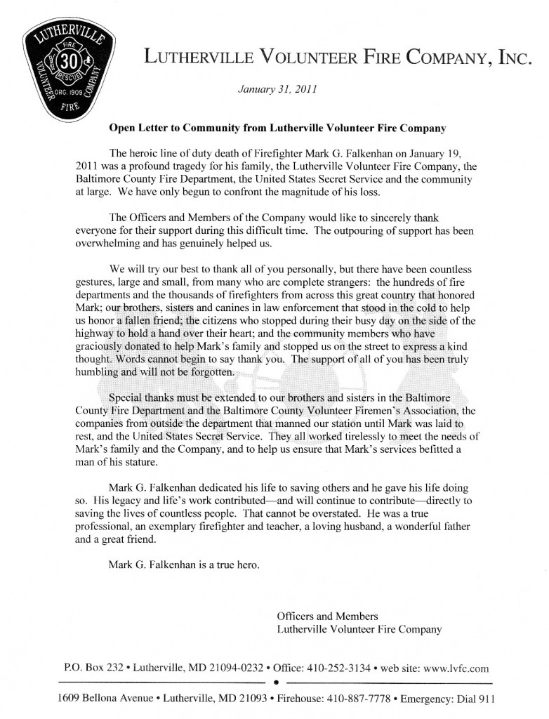 A letter of thanks from the Lutherville Volunteer Fire Company.