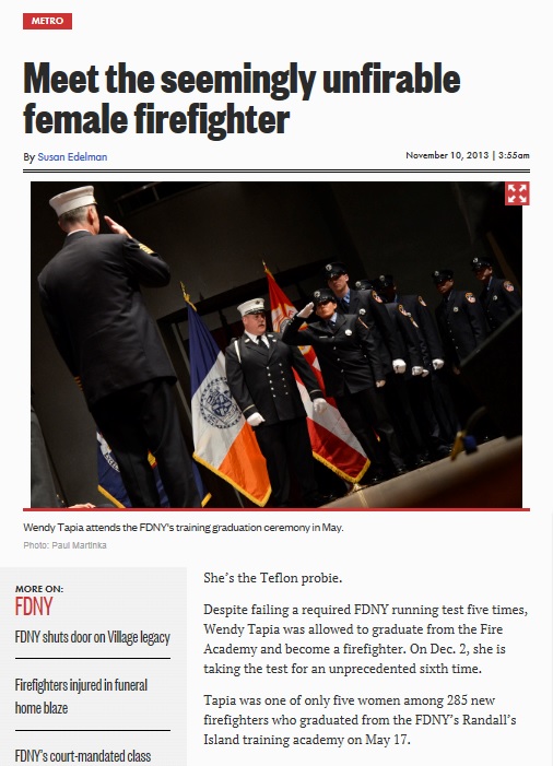 Is she unfirable? New York Post focuses on FDNY firefighter who hasn’t passed running test. This article is not satire.