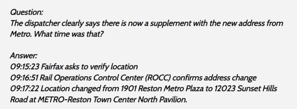 In fact, Fairfax County initially wanted us to believe that no one at DPSC was even aware there was an address conflict until 9:15 a.m., almost eight minutes after Metro’s call. That official information also turned out to be incorrect..